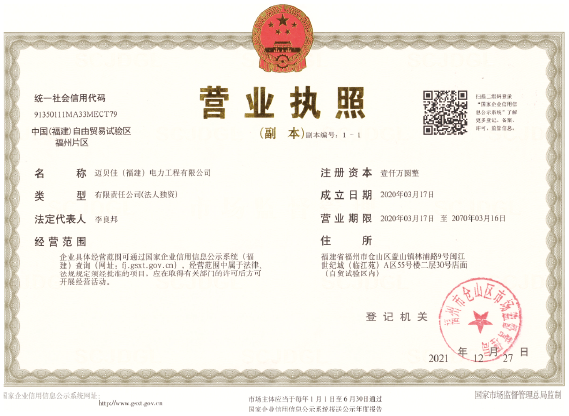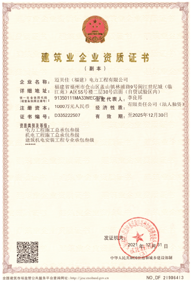 邁貝佳(福建)電力工程有限公司是光伏行業(yè)領(lǐng)軍企業(yè)——pc28預(yù)測(cè)新能源的子公司,公司成立于2020年。公司秉承“持續(xù)創(chuàng)新、卓越品質(zhì)、突破自我、融合共贏”的企業(yè)精神,以光伏電站項(xiàng)目建設(shè)和服務(wù)為核心業(yè)務(wù),擁有電力工程施工總承包叁級(jí)、機(jī)電工程施工總承包叁級(jí)、建筑機(jī)電安裝工程專業(yè)承包叁級(jí)、承裝修試電力資質(zhì)四級(jí)等資質(zhì)。