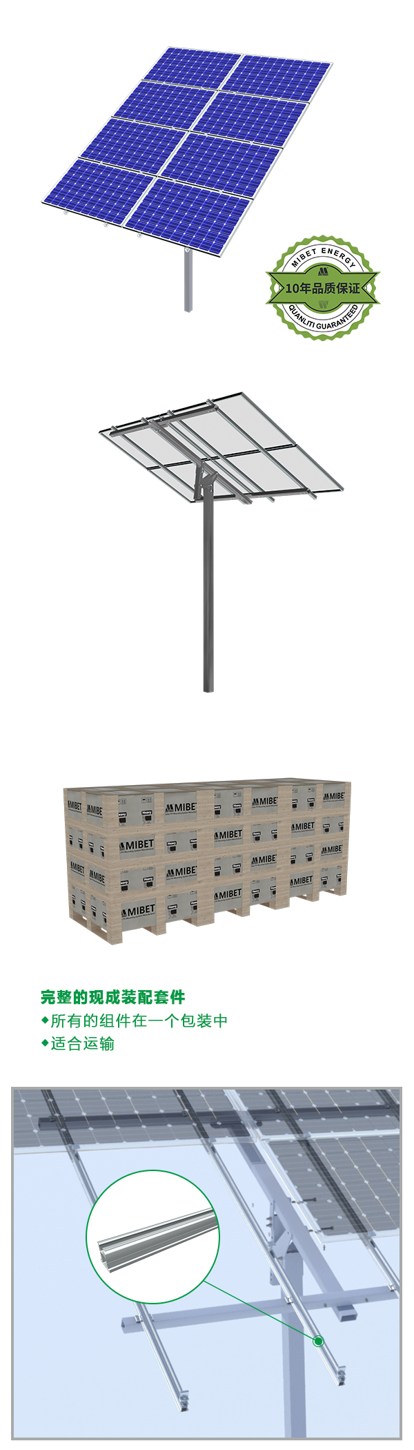 MRac 地面單立柱光伏支架 是一款專門針對大型商業(yè)及公共事業(yè)電站研發(fā)的解決方案,適用于各種小山丘及不平整區(qū)域項目,該產(chǎn)品設(shè)計靈活,可支撐6塊板、8塊板及10塊板,全部配件采用熱浸鍍鋅鋼和鋁合金,使用壽命更長,結(jié)構(gòu)上的優(yōu)化設(shè)計,有效的提高了安裝時效,大大降低了工程安裝成本。